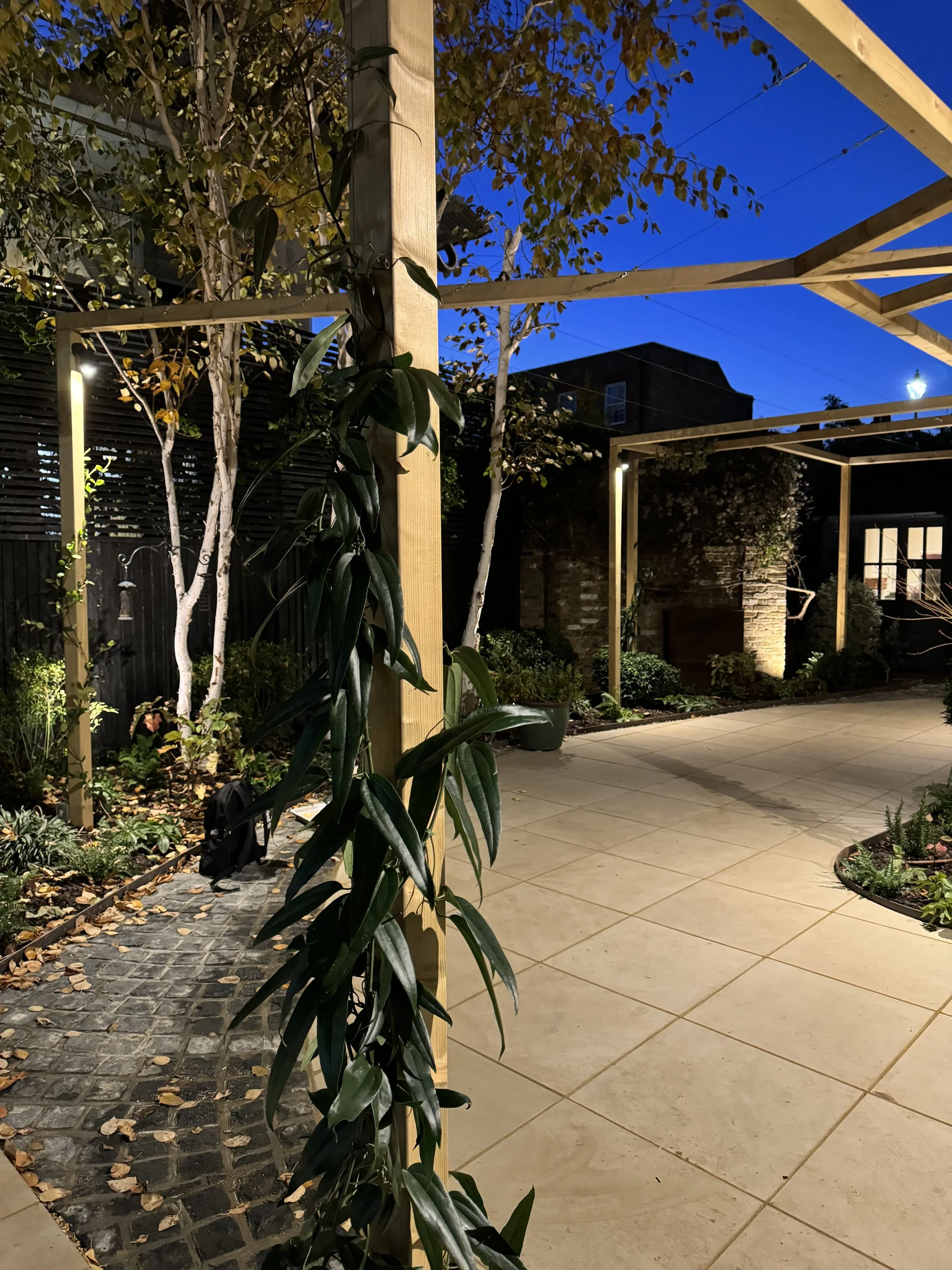 Extensive electrical works were carried out with a remote controlled zoned lighting system, Automated irrigation throughout. Extensive planting scheme with thirty climbers.