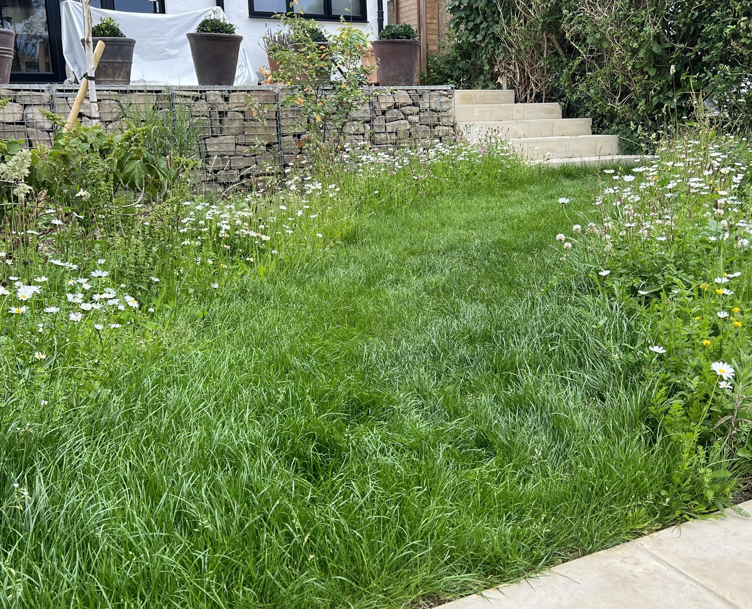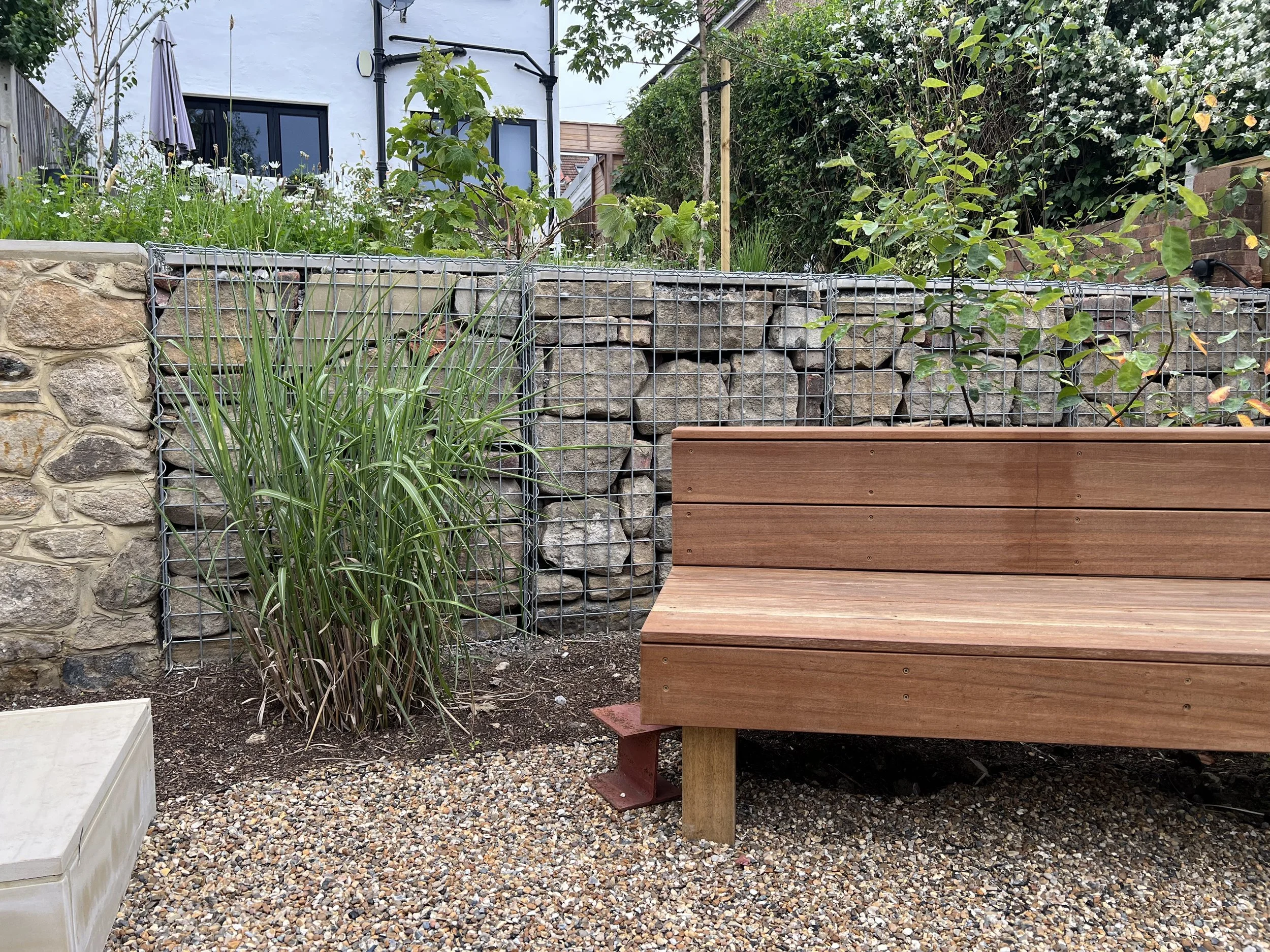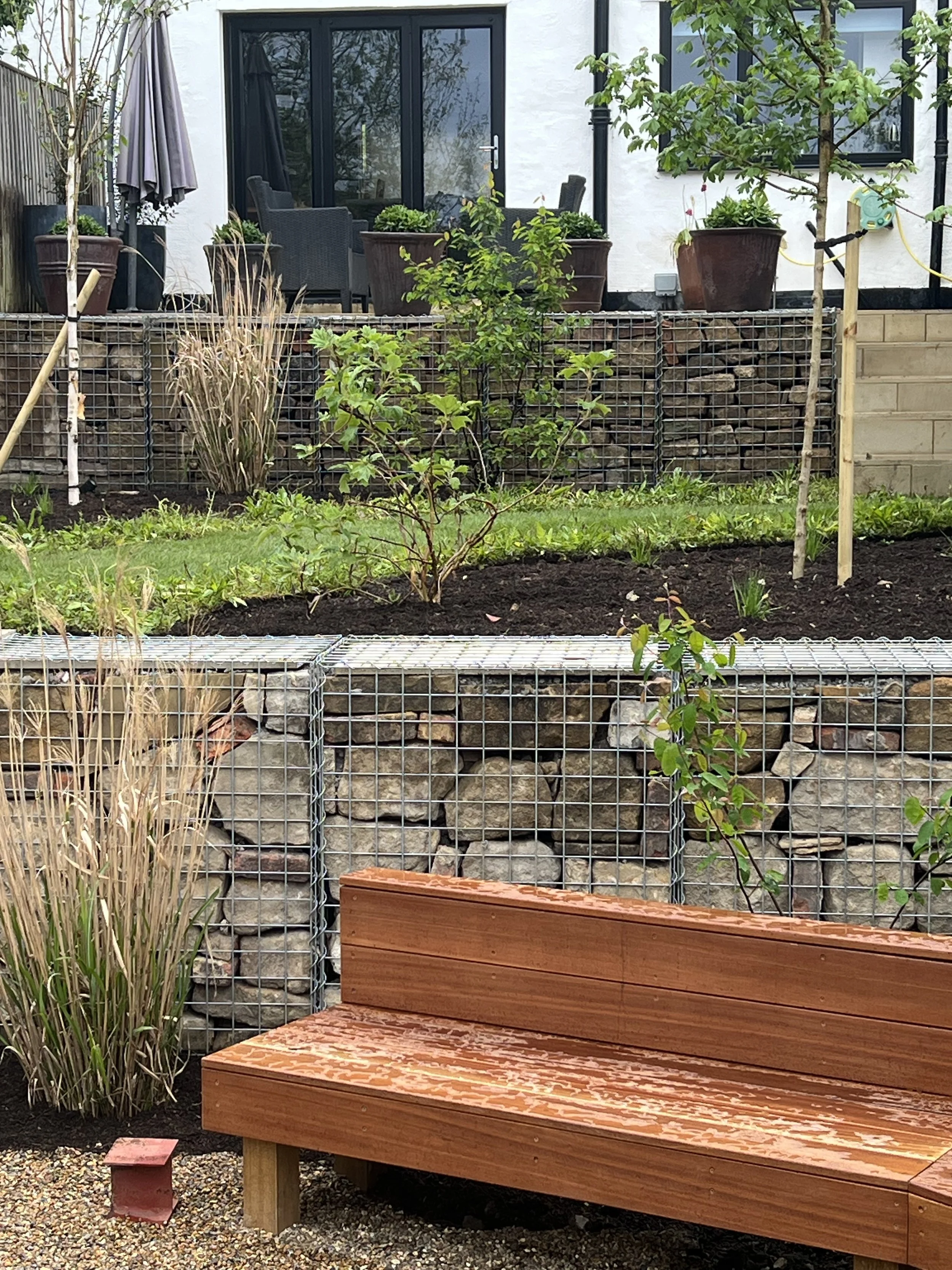 Gabions were used to retain the level and filled with reclaimed walling stone. Cumbrian sandstone used for the main terrace and steps. Wildflower lawn, native trees/shrubs and bulbs were planted.