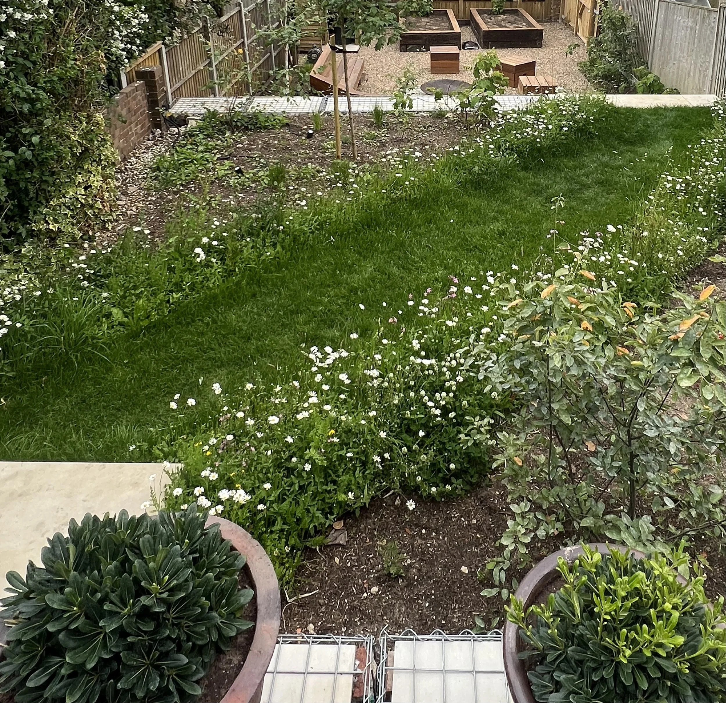 A sustainable drainage system (SUDS) driveway formed from gravel and a recycled plastic grid system formed the lower level with a vegetable planting area. A cobble zone allows the steel fire bowl to be located.